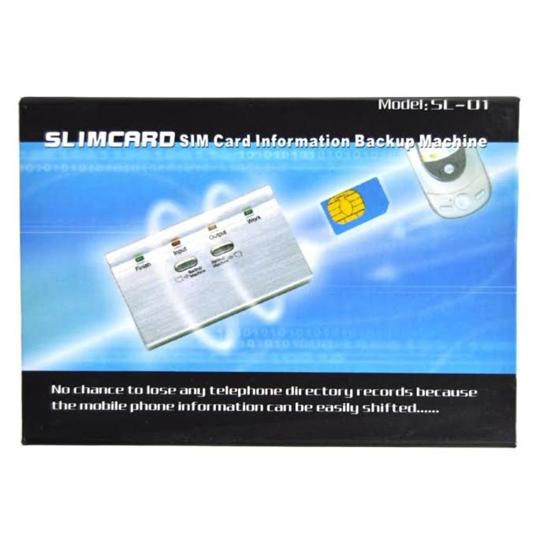 Záložní informační karta stroj Smart Card Sim je šikovný hi-tech produktů. To prostě dělá zálohu Vašeho telefonního seznamu (jména a telefonní čísla) na svém mobilním telefonu. Tyto informace adresáře z mobilního telefonu se pak uloží na čipové kartě.