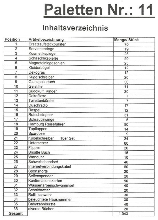 Obsah palety: 1,043 St několik článků!