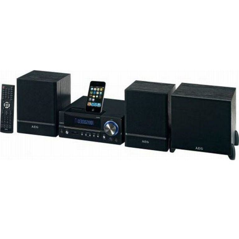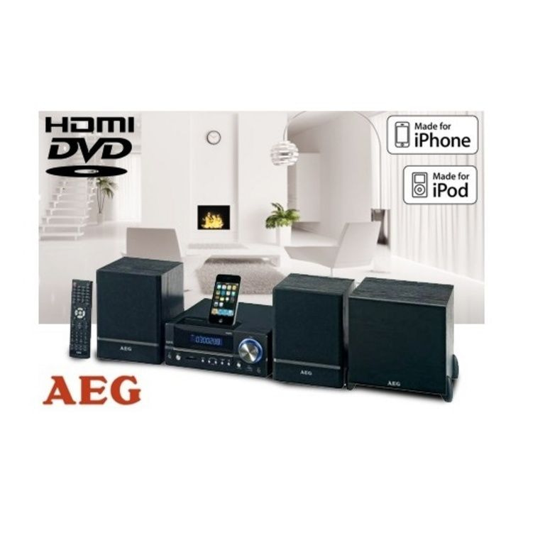 AEG DVD 4626 iP - 2,1 hudba s DVD a HDMI (1080p), 2 x stereo reproduktory, externí subwoofer, USB port, čtečka karet, iPhone / iPod * Dock, LED displej, anténa, dálkové ovládání, odnímatelný mřížka reproduktorů, vypínač a AUX-IN.