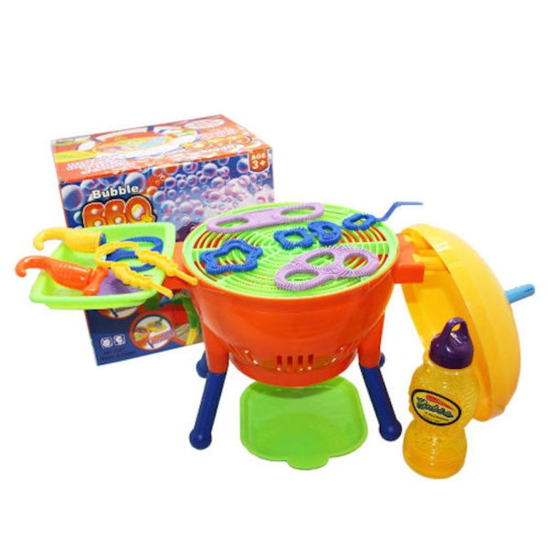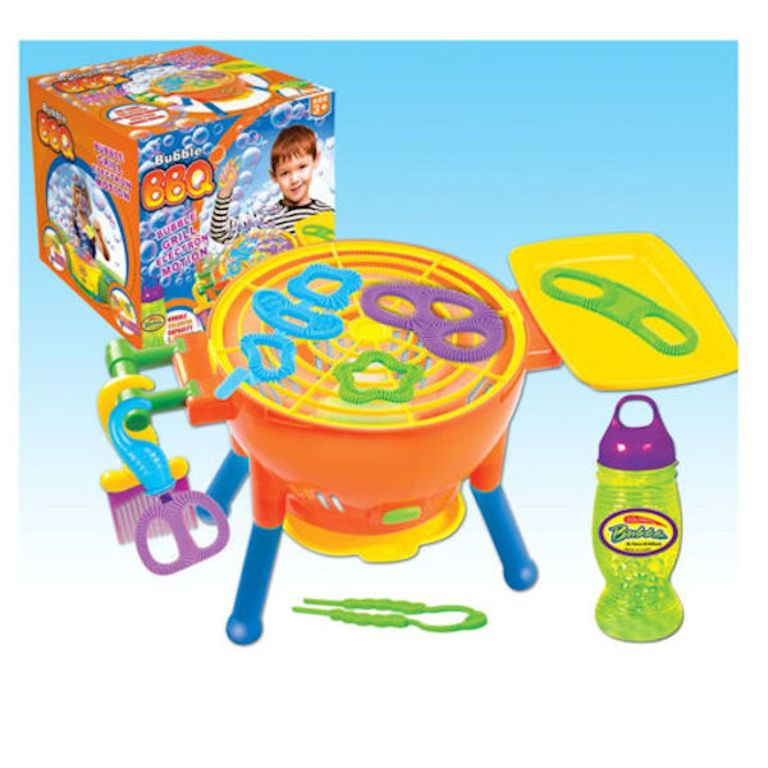 A barbecue for children who make big soap bubbles, by the battery operated propeller. A lot of soap bubbles comes the outside this barbecue grill.